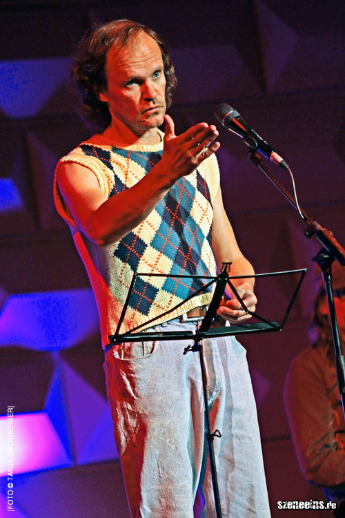Sein Erscheinungsbild, wie zu erwarten, Scheitelfrisur, der geliebte Acrylpullunder mit Rauten und eine überdimensional große Jeans, die an seiner schmalen Statur nur durch den Gürtel gehalten wurde. Mit ihm auf der Bühne zwei Musiker, die ihn bei seinen musikalischen Einlagen begleiteten. Ja, richtig, Schubert probierte sich auch im Gesang und verwies sogar seinen Gitarristen vom Platz, um sich selbst zu begleiten.